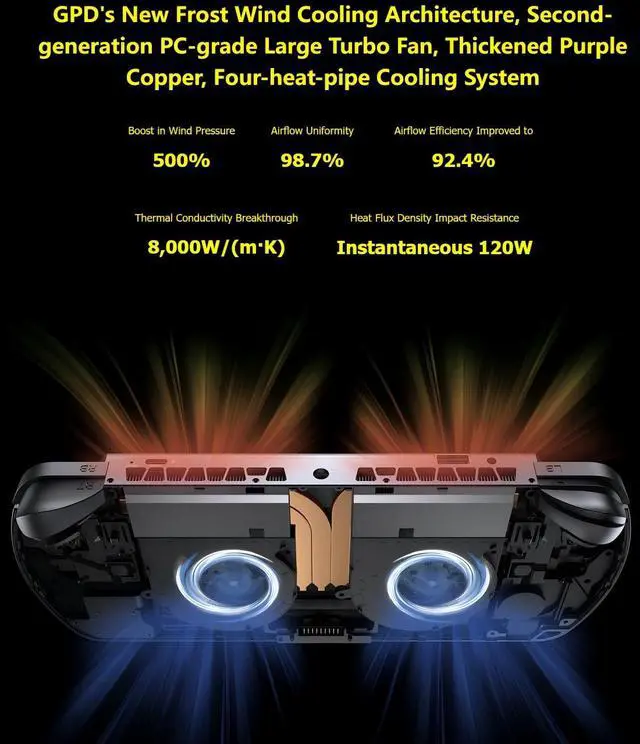 GPD's New Frost Wind Cooling Architecture, Second-generation PC-grade Large Turbo Fan, Thickened Purple Copper, Four-heat-pipe Cooling System