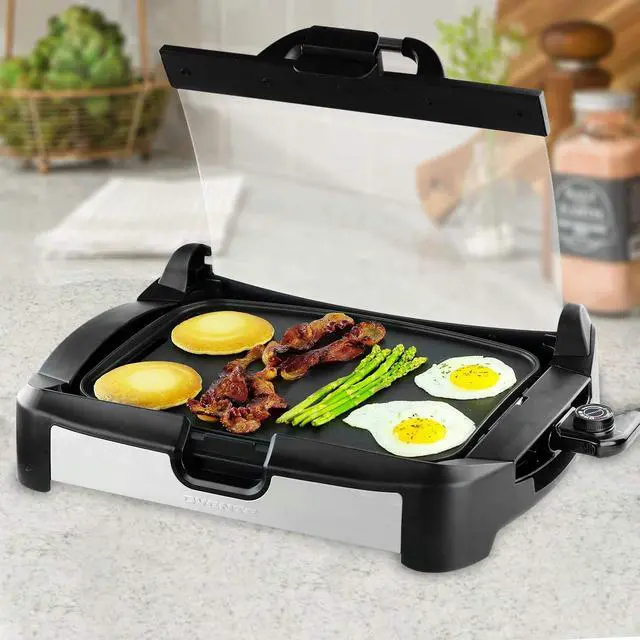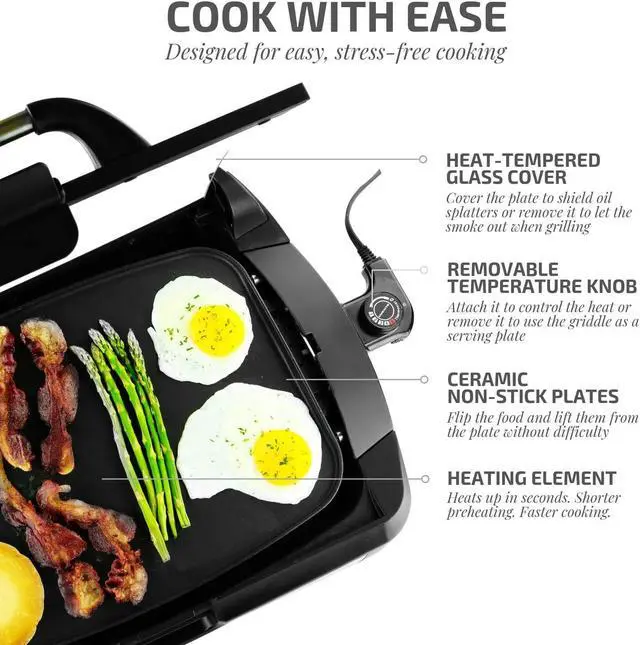 -Features: Reversible Grill & Griddle, Temperature Control Knob, Drip Tray, Removable Glass Cover, Scraper