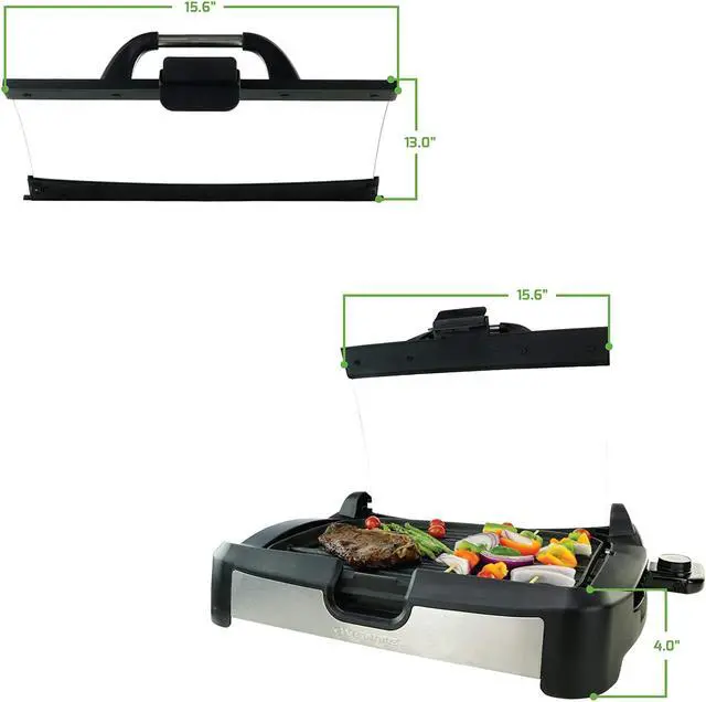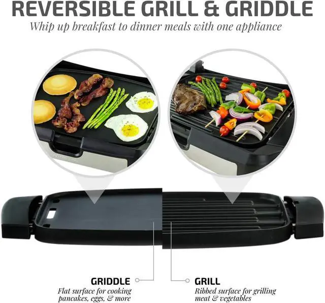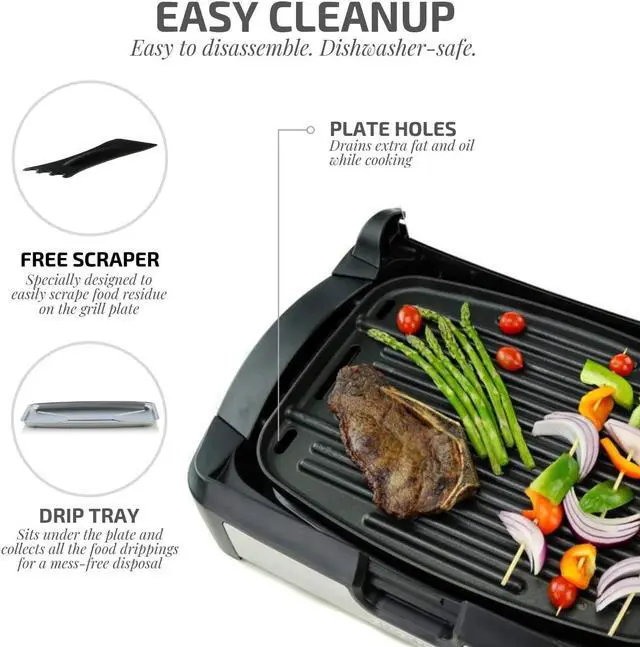 Its versatility goes beyond your typical grilled fare—you have the option to cook anything that cooks in a griddle or skillet too. From blueberry pancakes to juicy, grilled steaks, this grill/griddle does it all! It comes equipped with 1700 watts of power which allows it to instantly heat up and cook food faster than conventional grills or griddles. All removable parts are dishwasher safe (except for the temperature controller). The drip tray and base are cleaned easily from hand washing in warm & soapy water.