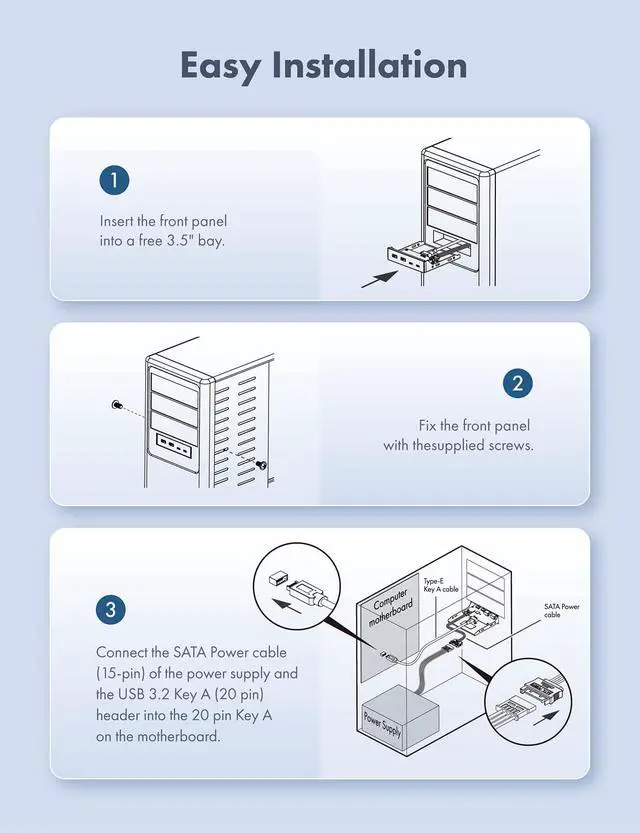 Installation is quick and easy, and the unit is plug and play. Simply fit 3.5 inches drive bay with the screws provided and plug this front panel into the external USB connector on the motherboard.
