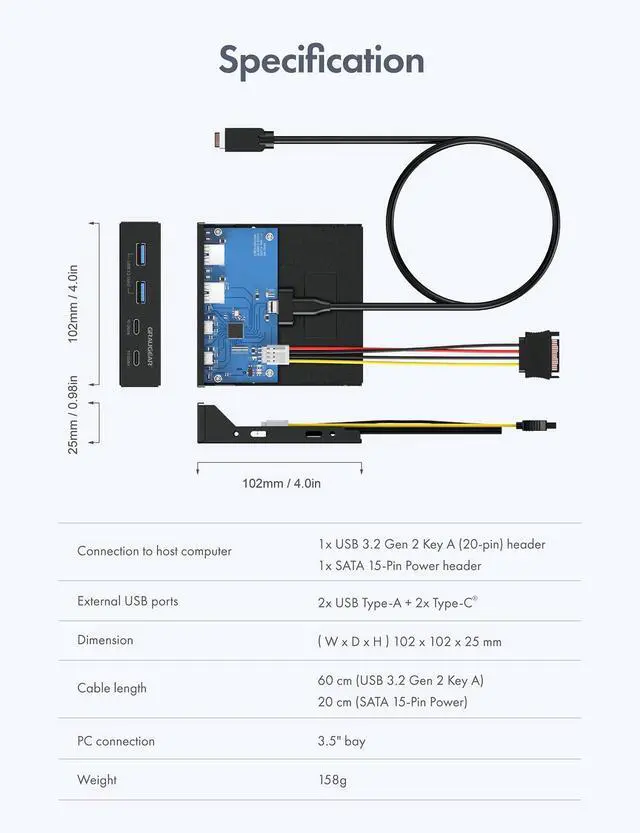 ![Main image of 3.5 Inch Front Panel Hub, 4 Ports Internal Metal USB Hub, 2X USB-C 10Gbps and 2X USB 3.2 Gen 2 Ports, USB3.2 Type-E Key-A 20-Pin Header & 15-Pin SATA Power Connector Required [G-MP02]](https://c1.neweggimages.com/productimage/nb640/C3WGD2601250UWRKU6D.jpg)