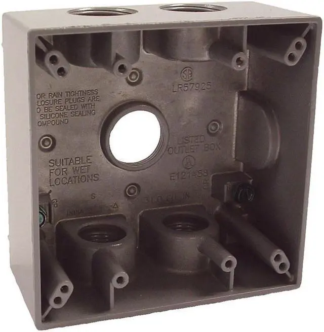 Weatherproof Electrical Box - 2 gang box with lugs, 2" deep with 5 outlets, 3/4" NPT. Made of corrosion-resistant aluminum, finished with a protective color coating. For wet locations, closure plugs and ground screw included. Individually shrink wrapped. Gray. UL listed. - Type: 2-Gang, NPT Size: 3/4 In., Number of Outlets: 5 Outlets, Color: Gray, Material: Aluminum, Depth: 2 In., UL Listed: Yes, Pkg Qty: 1, Package Type: Shrink Wrap WARNING: Cancer and Reproductive Harm www.P65Warnings.ca.gov -