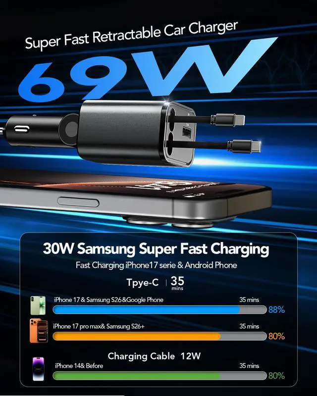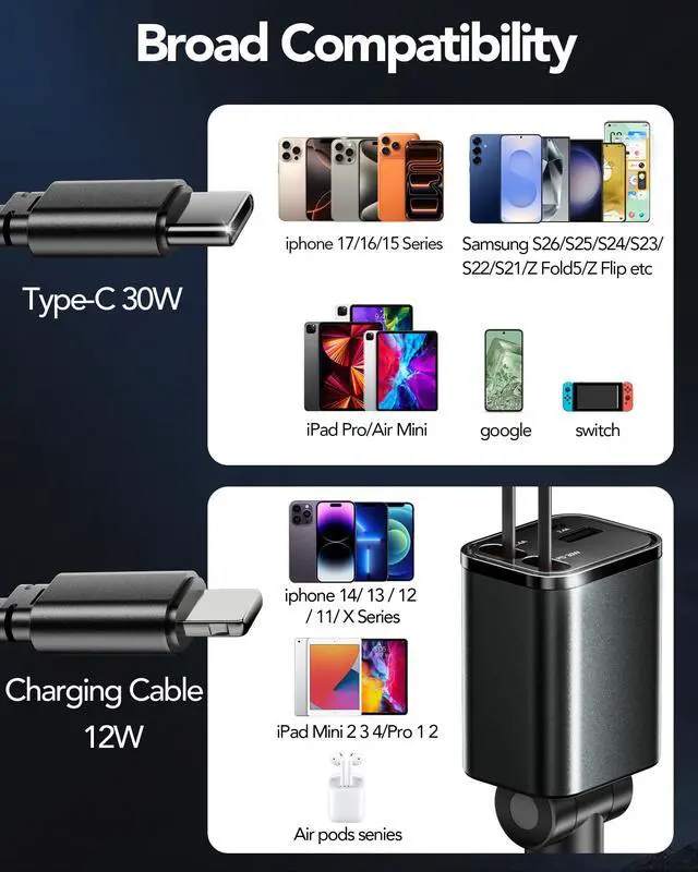4 in 1 Retractable Car Charger for iPhone 17 Fast Car Phone Charger