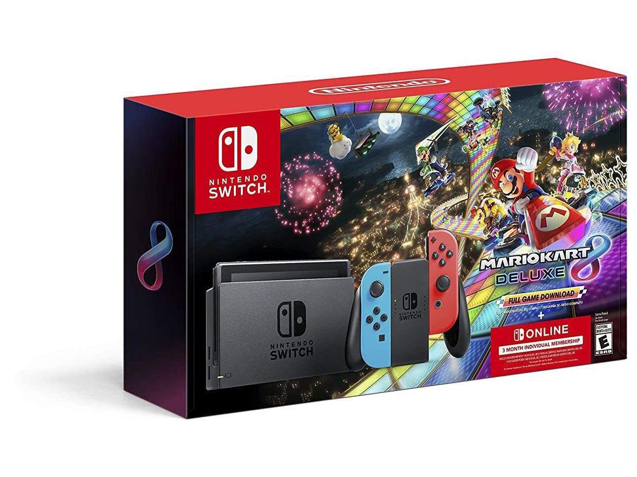 Includes a Switch console, Switch dock, Joy-Con (L) and Joy-Con (R), Joy-Con grip, AC adapter, HDMI cable, and two Joy-Con strap accessories, Mario Kart 8 Deluxe, and a Nintendo Switch Online 3-Month Individual Membership.