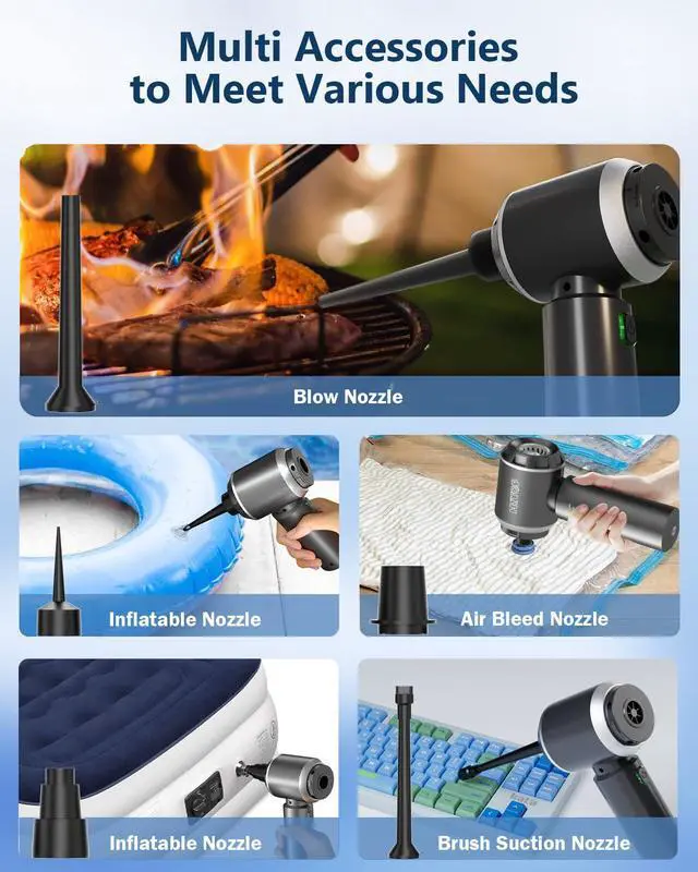 4-in-1 design with vacuuming, blowing, inflating, and suction functions.