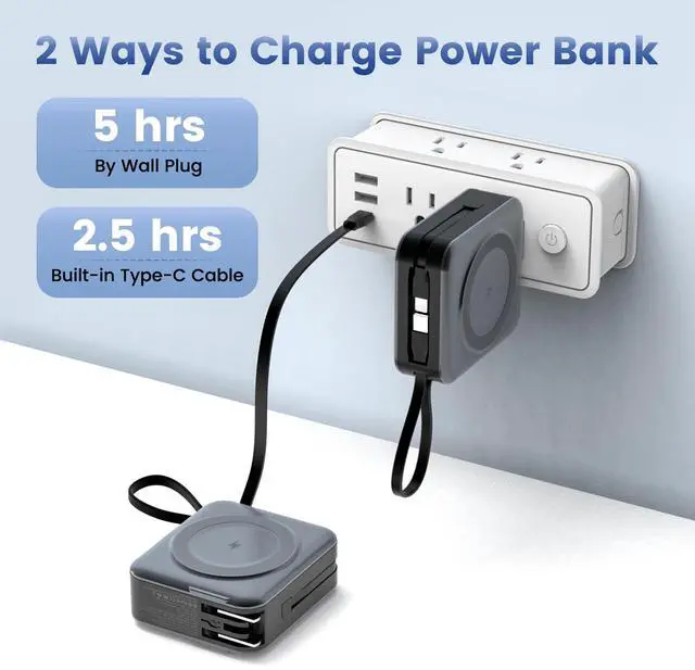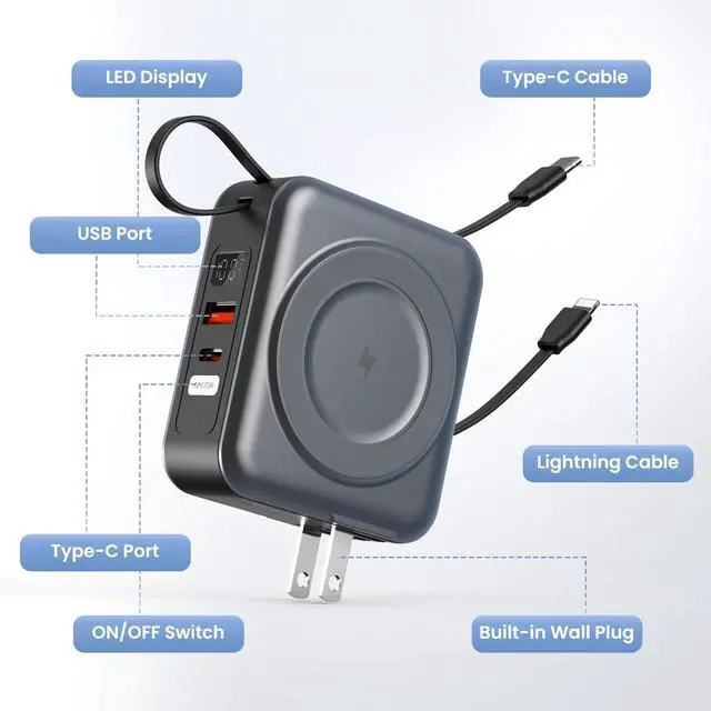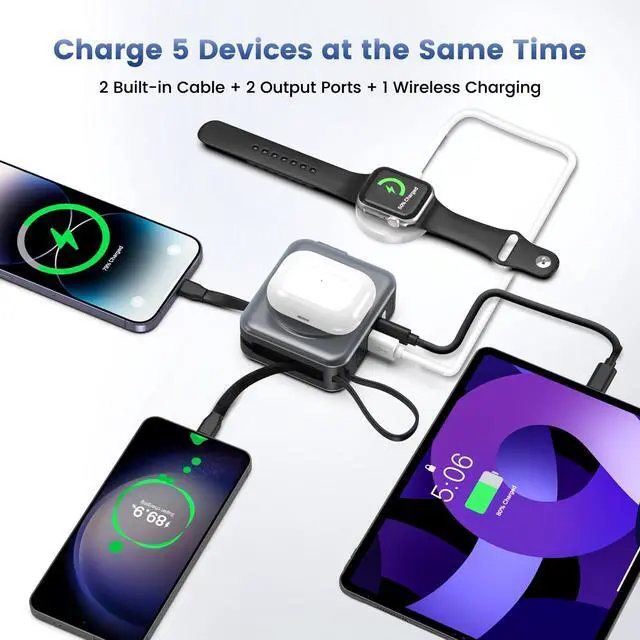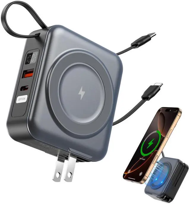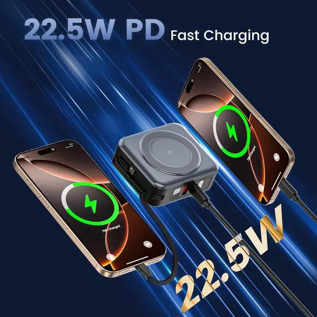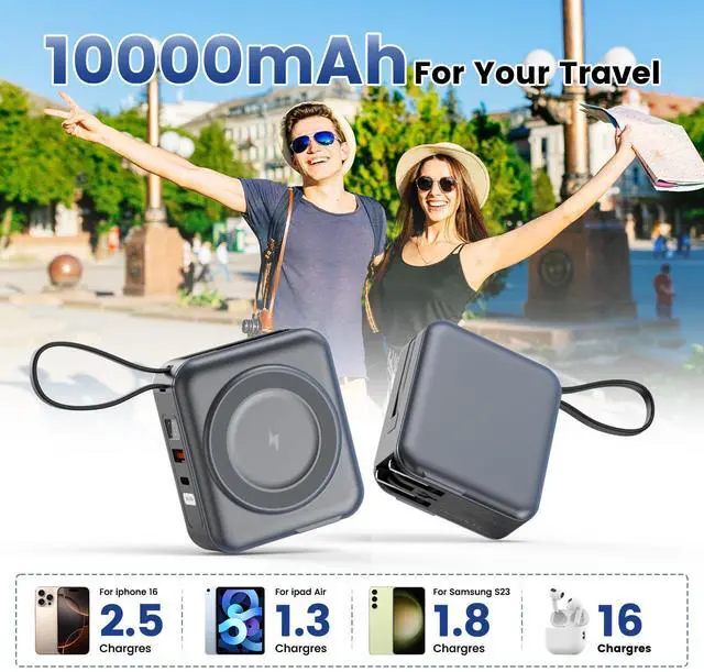 10000mAh High Capacity 15W pd fast wireless charging, meet your daily needs. Built-in 2 cables(15W iOS cable, 22.5W Type- C cable- support input/output). 15W USB output port, 22.5W Type-C port- support input/output. Can charge 5 devices simultaneously. Compatible with iPhone, Android,and other devices. This magnetic charger seamlessly attaches to your iPhone 17/17air/17 Pro/17 Promax/16/16 Plus/16 Pro/16 Pro Max, 15/14/13/12 series.