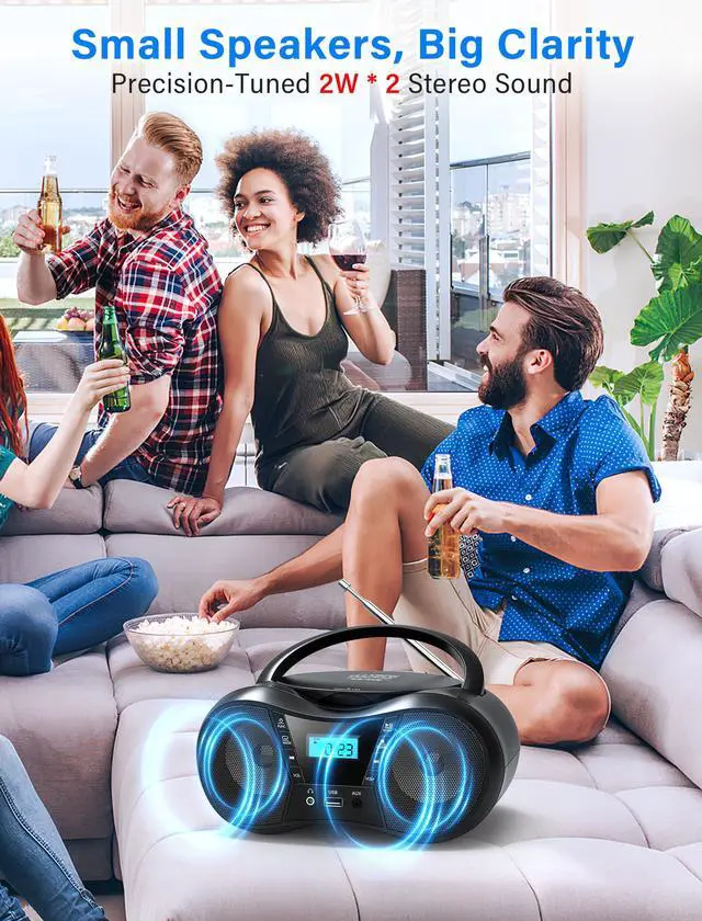 Lossless Bluetooth & Effortless ConnectivityThis wireless bluetooth CD player portable boombox features Bluetooth 5.1 technology for powerful, well-balanced sound with minimal distortion, bringing you unparalleled sound quality, perfect for games, music and movies.