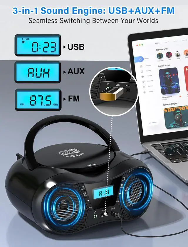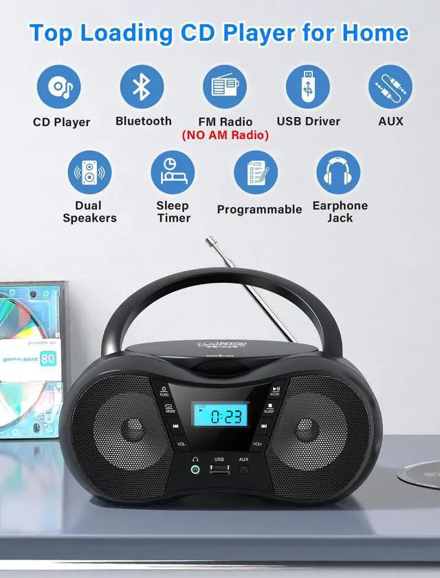 - [AUX/USB Supported & Sleep Timer]Includes AUX jack - Output audio from cell phones, MP3 players, computers to our boom box with cd player; USB port - Play audiobooks/music. Our portable cd player boombox with bluetooth features an auto shut-off option for 0-90 minutes, so you can set the timer and turn off the music without getting out of bed