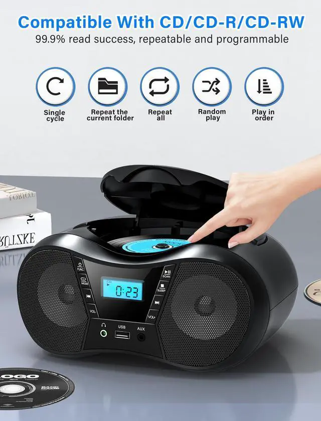Compatible with Multiple CD FormatsThe boombox cd player supports CD / Bluetooth / USB/ AUX / FM Radio playback in multiple modes. Widely compatible with CD, CD-R, CD-RW. Supports normal playback, single-track repeat, full-track repeat and random play modes.