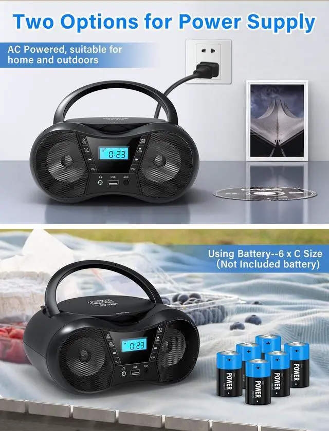 - [Wide Application & Complete Package]Packges Includes: Boombox with CD Player and Radio *1, AC Power Cord *1, AUX Cable *1, User Manual *1. Perfect for youth, elderly, parents, friends, indoors and outdoors use. Enjoy free support at any time for peace of mind