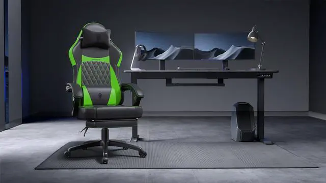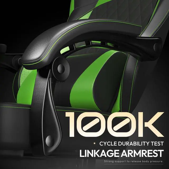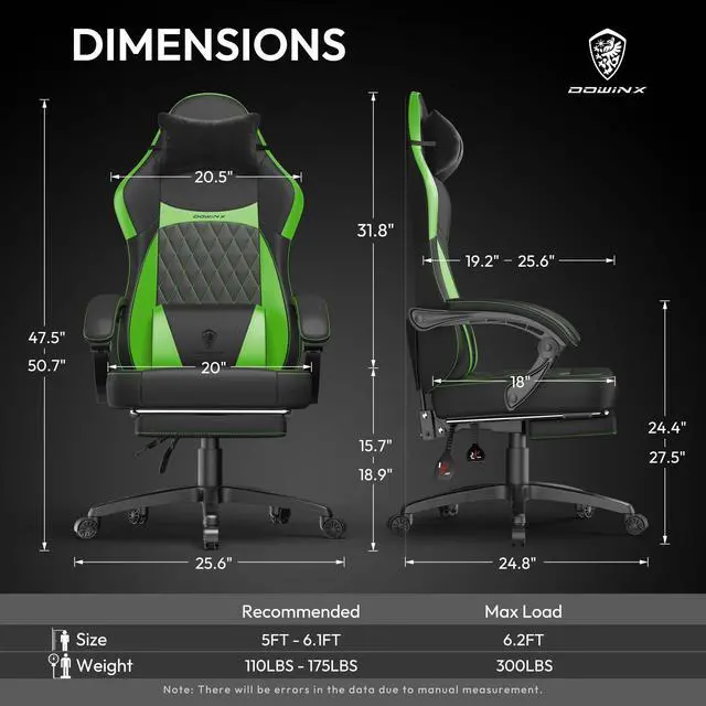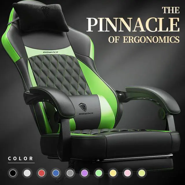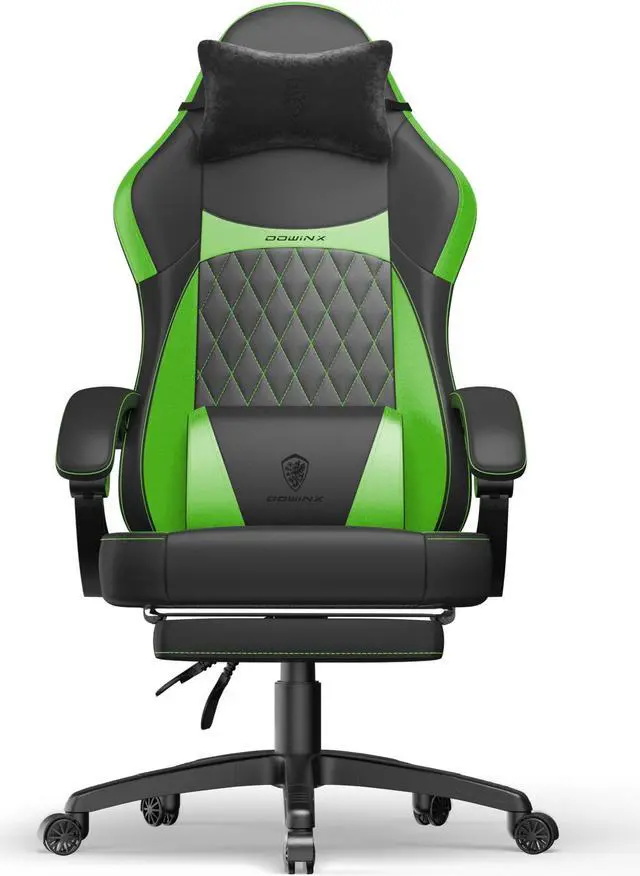 Dowinx Ergonomic Gaming Chair with Pocket Spring Cushion and Massage Lumbar Support, High Back Leather Office Chair with Footrest, 300LBS Capacity, Black Green