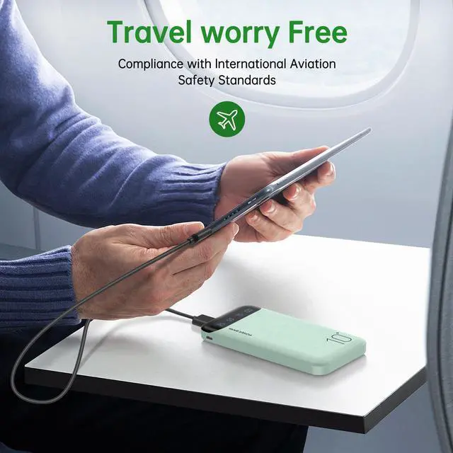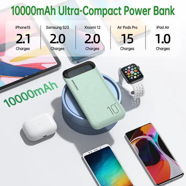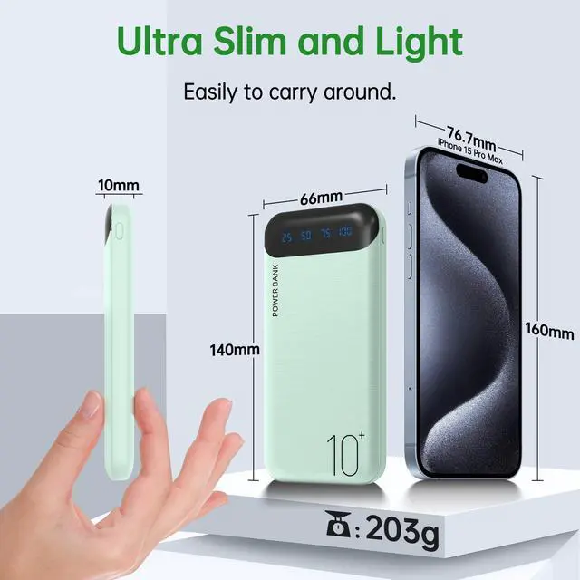 THINNEST 10000mAh EXTERNAL BATTERY PACKThe market's one and only 0.39-inch power bank that breaks the limit of 10000mAh, and 0.45lb lightweight. It is a perfect travel charger to slipped into any travel lover's pockets or bag, without feeling bulky. 10000mAh charging capacity is long lasting enough to charge your iPhone 14 2.3 times, Samsung Galaxy S23 2 times, or AirPods Pro 15 times, keeping your devices full power while on the go. (Airline-approved)