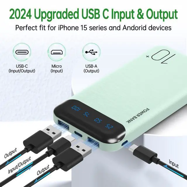 2024 UPGRADED VERSION USB C IN & OUT POWER BANKYOBON upgraded our 10000mAh portable battery backup in 2024, unlike only recharge via USB-C port, now this power bank can also charge devices with your USB-C cables directly. Upgrade portable battery charger has a USB-C In & Out port to perfectly fit your new iPhones, iPad and all upcoming USB-C devices.