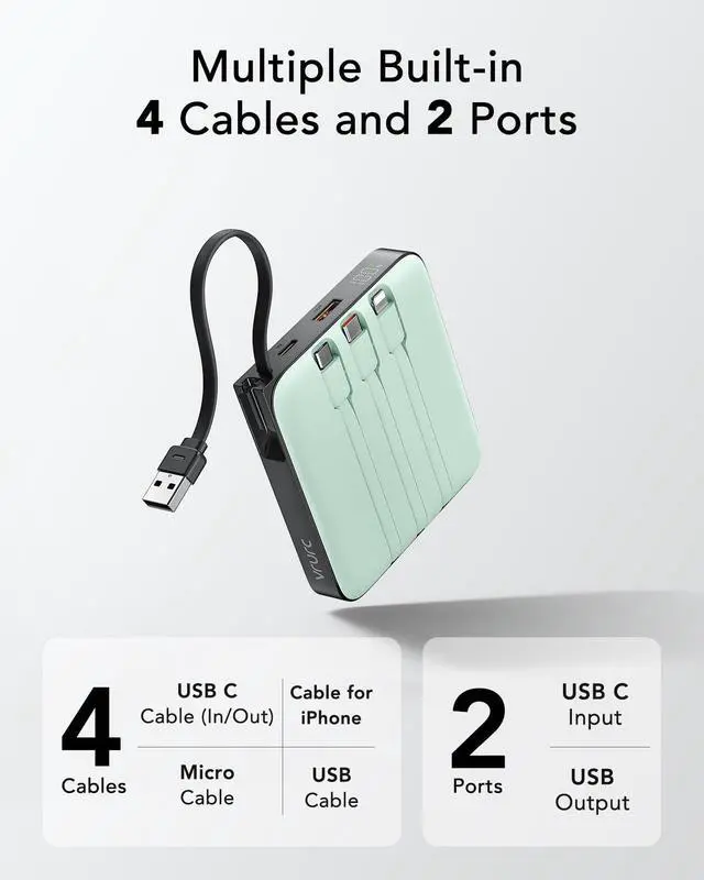 Power up your life with our versatile mobile power bank with USB-C Cable(also compatible with iPhone 17/16/15 series), Apple Cable, USB-A, and Micro ports.