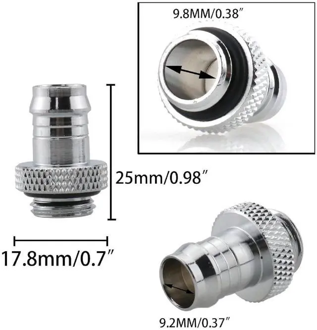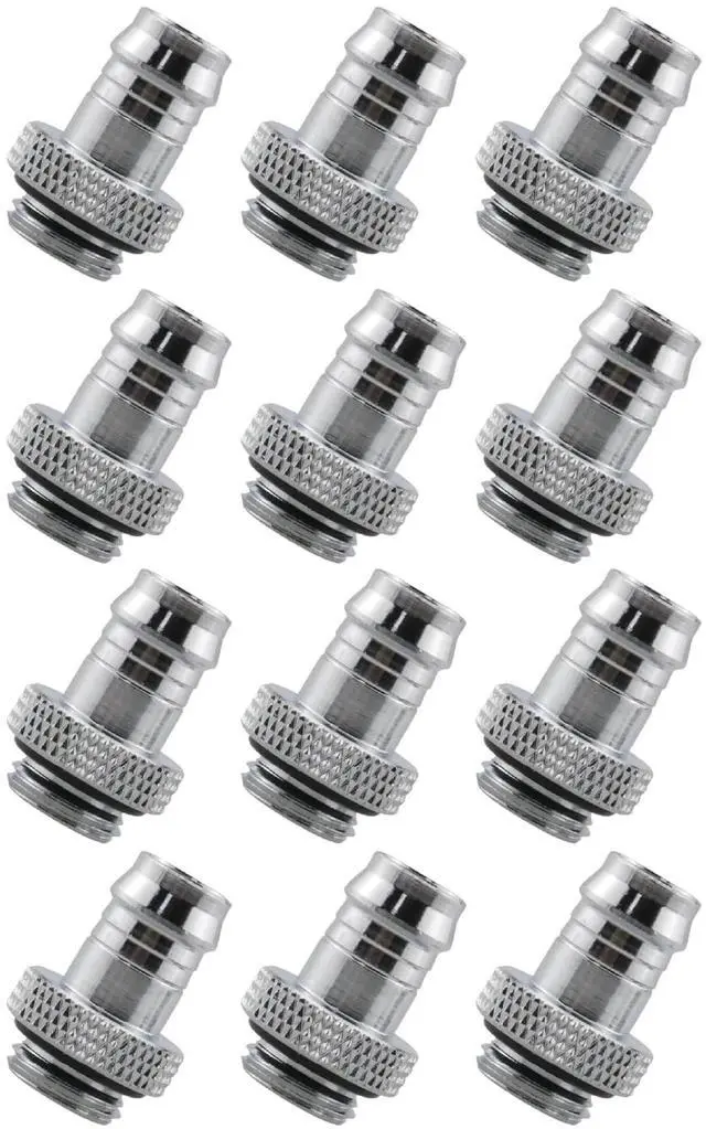 The Dracaena.io 12 Pack of G1/4" Thread to 3/8" Barb Fittings offers a quick, secure, and leak-proof solution for soft tubing in custom PC water cooling systems. Each connector features a G1/4" male thread with an O-ring seal and a 3/8" (ID) barb, ensuring reliable performance and easy installation. Compatible with 910mm inner diameter soft tubes, these fittings provide versatile compatibility across a wide range of setups. Built from premium brass with a durable black chrome finish, they deliver excellent resistance to rust and long-term durability. With precise dimensions11mm barb outer diameter, 15mm barb length, 5mm thread length, and 25mm overall lengththese connectors are engineered for a perfect fit, making them an essential component for any high-performance water cooling loop.