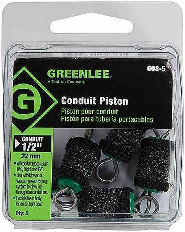 Conduit Piston, Product Type Piston, Overall Length 2 in, Tensile Strength Not Applicable, Compatible Conduit EMT, IMC, Rigid, Compatible Conduit Size 1/2 in, Material Foam, Overall Height 2 in, Overall Width 0.5 in, Color Green, Compatible Blower/Vacuum Series Greenlee, Package Quantity 5. This item has been restricted from sale in the following state (s): []