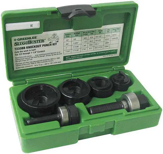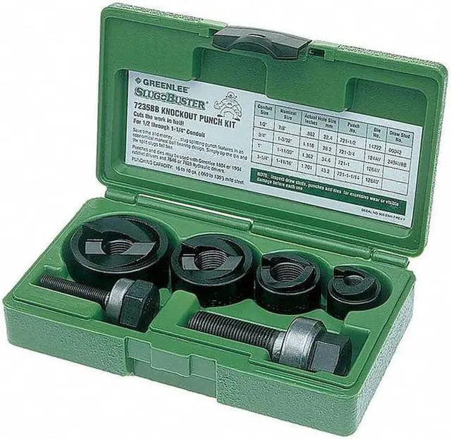 Knockout Punch Set, Number of Pieces 10, Capacity 10 ga Steel, Conduit and Pipe Size 1/2 in to 1-1/4 in, Workpiece Material 10 ga Mild Steel, For Use With Manual Ratchet and Driver, Includes 1/2, 3/4, 1, 1-1/4 in Slug Buster Punches and Dies, Draw Studs and Plastic Carrying Case. This item has been restricted from sale in the following state (s): []