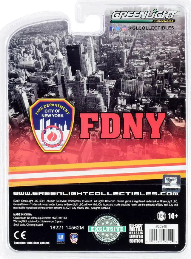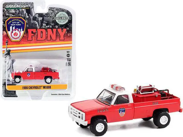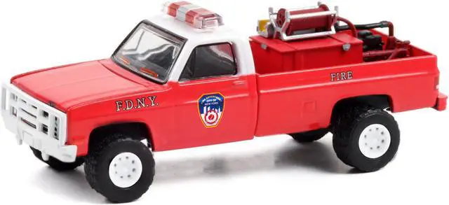 Brand new 1/64 scale diecast car model of 1986 Chevrolet M1008 Pickup Truck Red with White Top with Fire Equipment, Hose and Tank "Fire Department City of New York" (FDNY) "Hobby Exclusive" die cast model car by Greenlight.