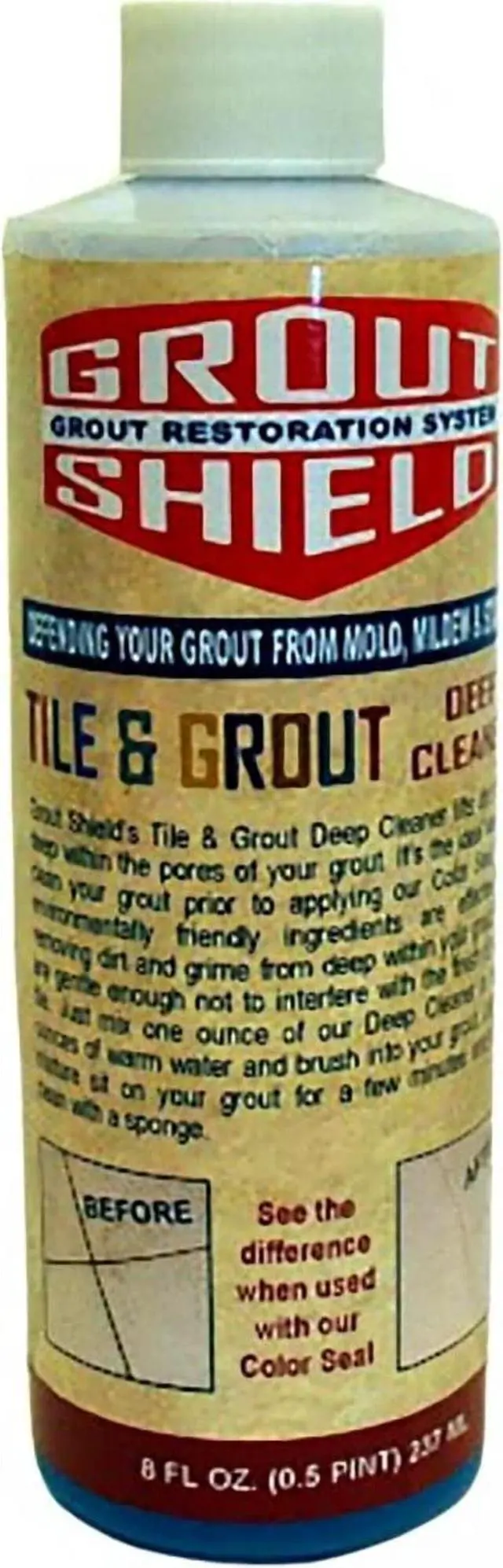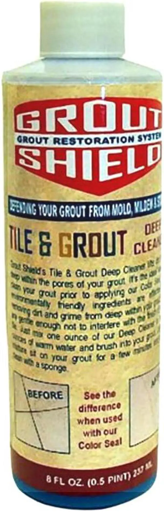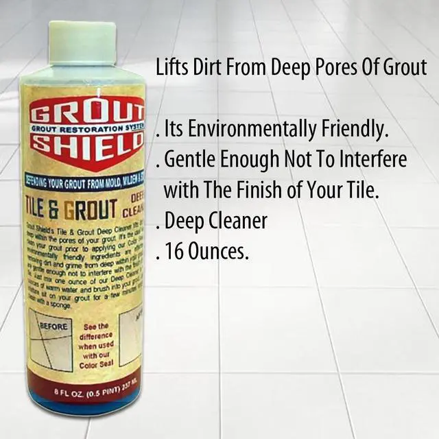 Grout Shield Tile and Grout Deep Cleaner is a 16-ounce cleaning solution specifically designed for deep cleaning tile and grout surfaces. This product helps to remove dirt grime and buildup from grout lines and tiled areas making it suitable for use in kitchens bathrooms and other tiled spaces. Its formula targets tough stains and residue helping to restore the appearance of your tile and grout.