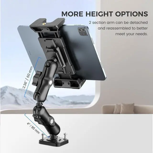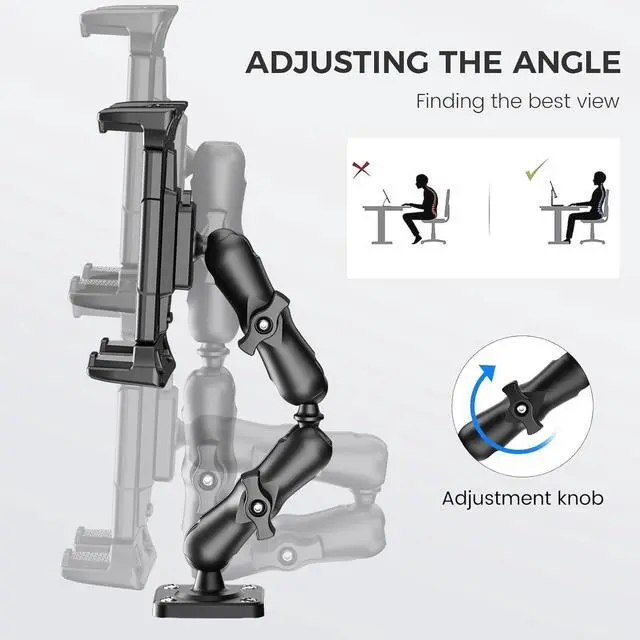 Upgraded Support Arm: The newly upgraded tablet holder for truck is twice as long as the arm of the conventional holder and offers two adjustable knobs and a 360° swivel ball head for easy switching between landscape and portrait modes.