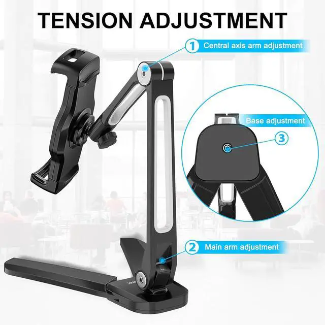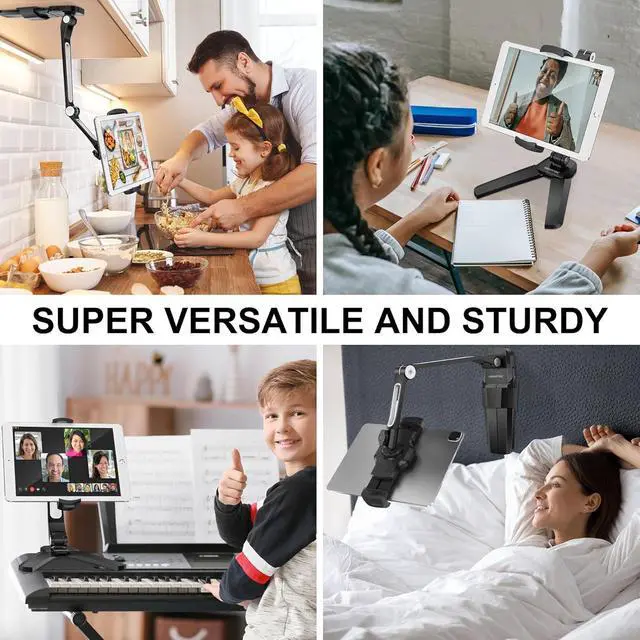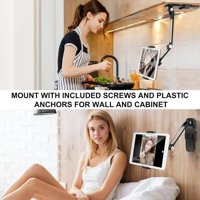 MOUNTABLE TABLET STAND Finally this is a high flex 360° wobble-free hands-free under-counter iPad mount in a sleek modern kitchen-elevating style youre not embarrassed to leave on display. Bolstered by ultra-reinforced knock-proof aluminum hands feet and base the iPad mount pivots to your perfect viewing position. MULTI-FUNCTIONAL & VERSATILE - 86° Adjustable base 360° pivot and four adjustable joints allow you to perfectly position your tablet so you can watch recipe tutorials and take meetings hand-free while you cook work or relax. Two Allen wrenches are included to make your installation a breeze. WIDE COMPATIBILITY - Universal-sized under cabinet-mounted tablet holder holds tight to any 4.7 -inch to 13.5 -inch iPhone iPad Pro / Mini Microsoft Surface series or whatever they dream up next.