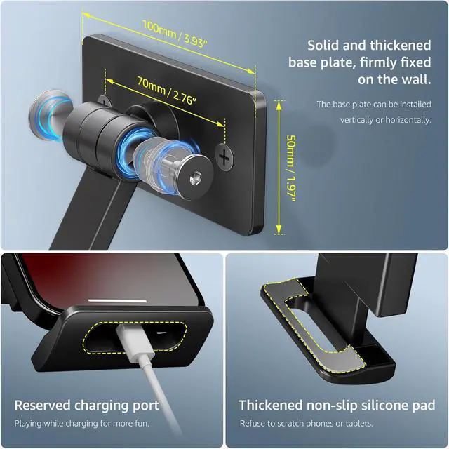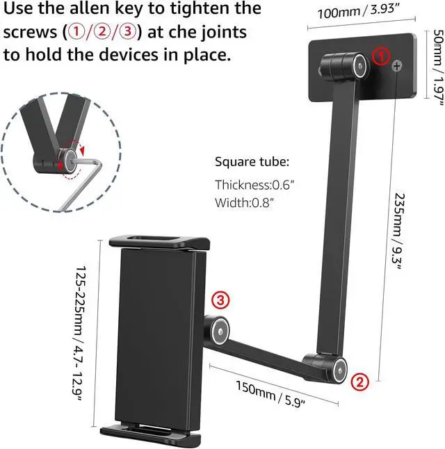 Compatibility: This aluminum tablet wall mount is compatible with 4.7 - 12.9 inch mobile phones and tablet devices such as iPhone 11/12/13/14/ProMax Galaxy iPad Surface Surface pro iPad pro 12.9 / 9.7 and so on.