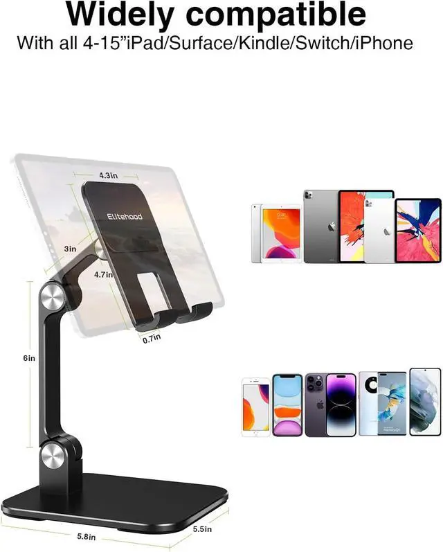 Taller Desktop Stand: Instead of a single pivot or two pivots elitehood desk iPad stand has a THIRD joint. Therefore it can extend and raise your tablet to a higher level ( 7.5 inches from the bottom of tablet to the tabletop) for your zoom meeting reading and watching and your neck doesnt hurt from bending over during working.