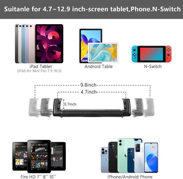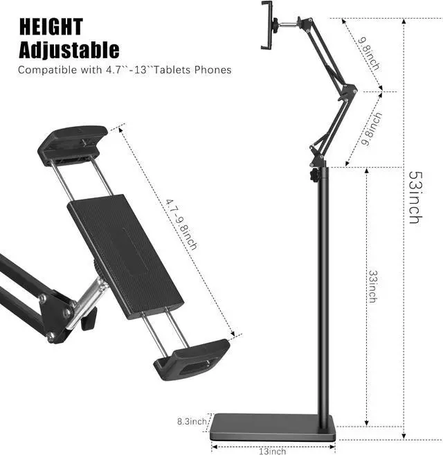 Wide Compatibility: Our tablet floor stand is compatible with all Phones and tablets between 4.7 -13 inch-screen. (Any cases with a width between 4.3 - 9.8 (11cm- 24.8 cm) and thickness within 0.63 ( 1.6 cm) are suitable.