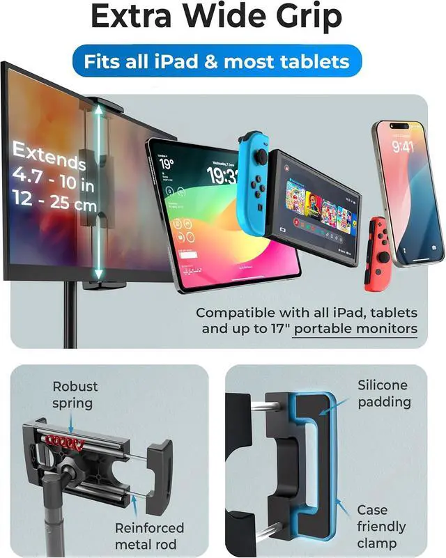 PORTABLE MONITOR STAND: This Tablet Stand for Desk supports everything from iPad mini to Ipad Pro 13-inch to heavier 17-inch portable monitors up to 4.4 lbs; this Stand for Ipad has reinforced silicone-padded clampONE