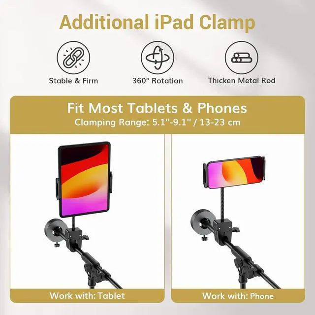 & Portable: An additional iPad clamp is included as a bonus which can hold a phone or an iPad (clamping range: 5.1 ''- 9.1 '' / 13-23 cm); all components can be stored in the attached storage bag for easy transportation