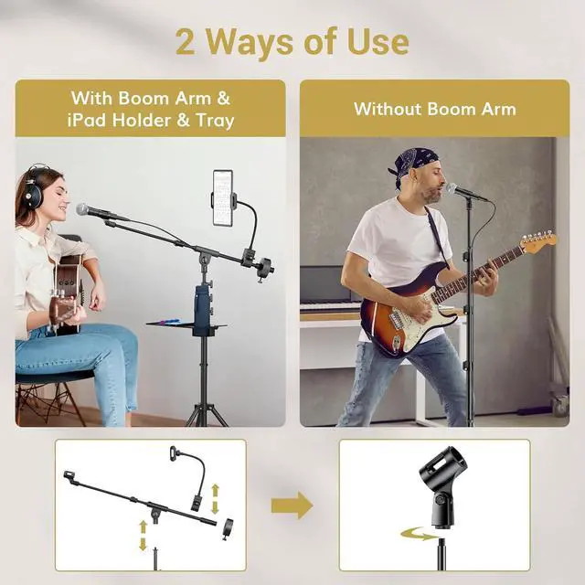& Removable Boom Arm: Adjusts from 17.7 '' to 30.3 '' (45cm to 77cm) with 360° horizontal and 180° vertical rotation; easily set the ideal angle and length using the knob; remove the boom arm and install the mic clip to convert to a straight mic standConvenient