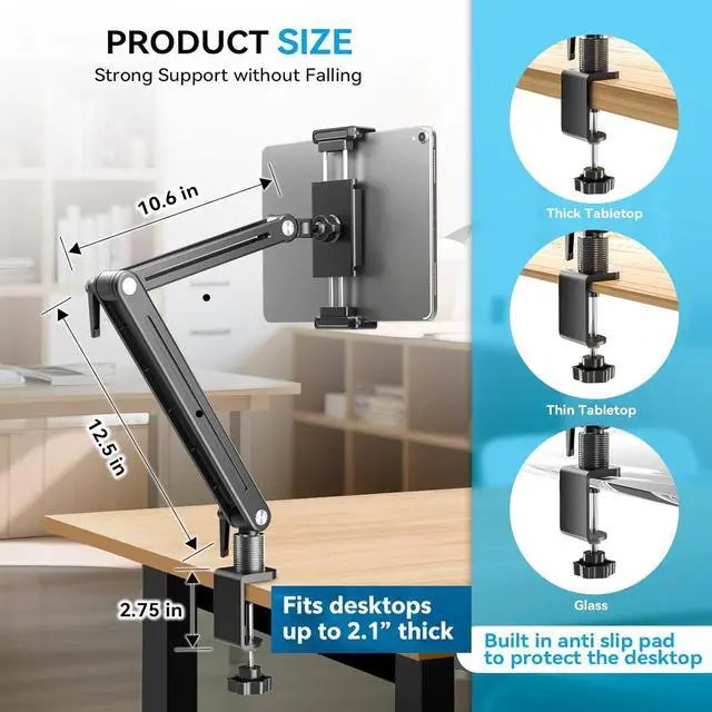 Flexible Adjustment: Featuring two side wrenches this ipad arm mount allows multi-angle and height adjustments the tablet mount can enhancing daily work efficiency and usage comfort.