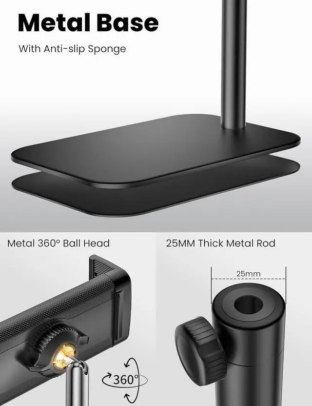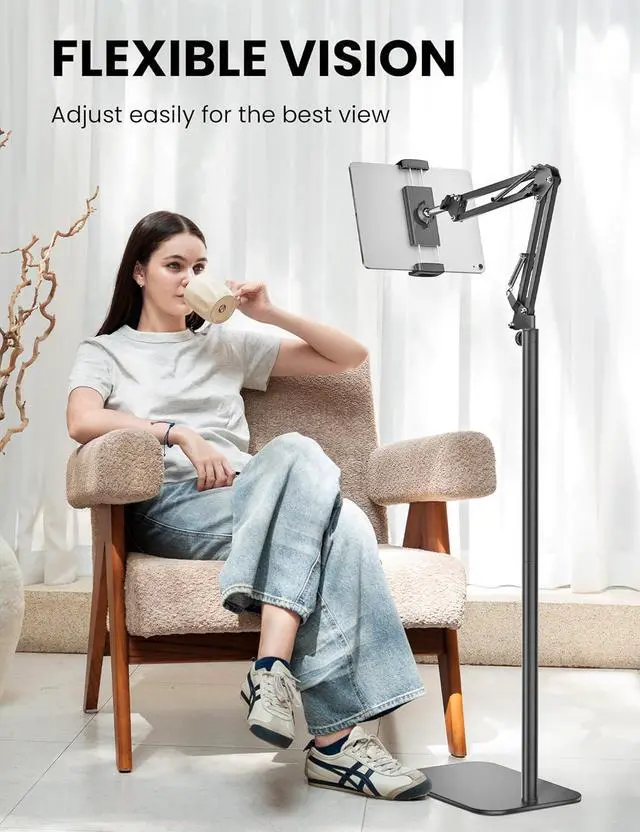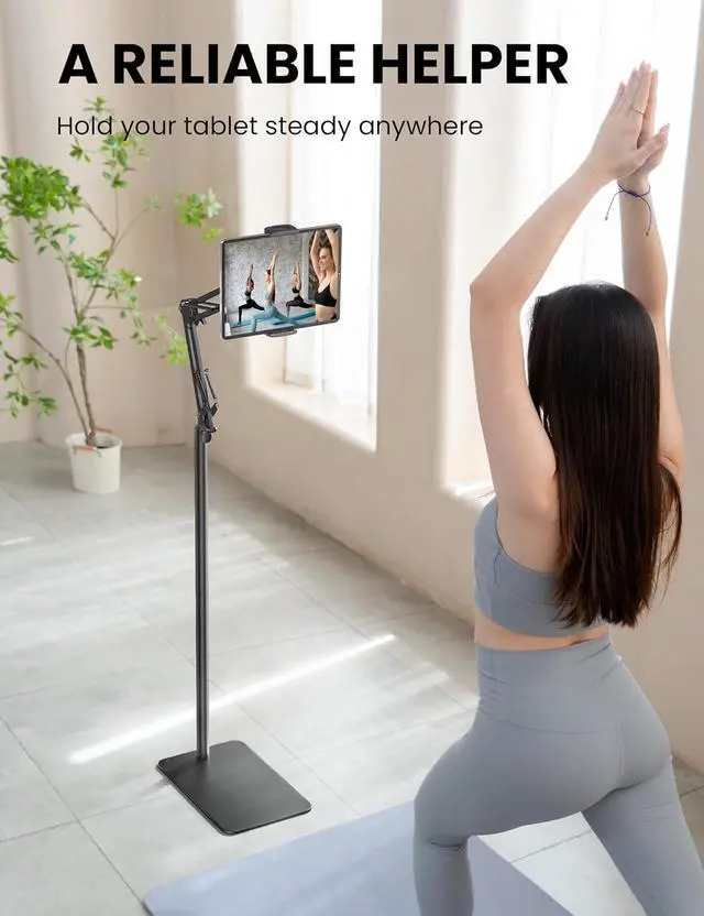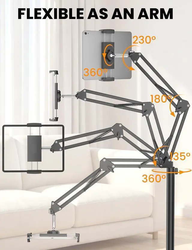 Free Your HandsThis tablet stand securely holds your tablet or phone at the perfect viewing angle. Whether you're streaming videos on video calls cooking or exercising it keeps your hands free so you can fully immerse yourself in what you love. Flexible Multi-Angle AdjustmentDesigned with a multi-joint arm and a metal ball head this ipad stand allows smooth adjustments in both angle and height. Whether you're sitting standing or lying down you can quickly find the most comfortable position. This ipad holder helps reduce neck strain and brings comfort to your daily life. Stable Base & Reliable Structure The thickened metal rod and 3.08LB non-slip metal base provide a solid foundation.
