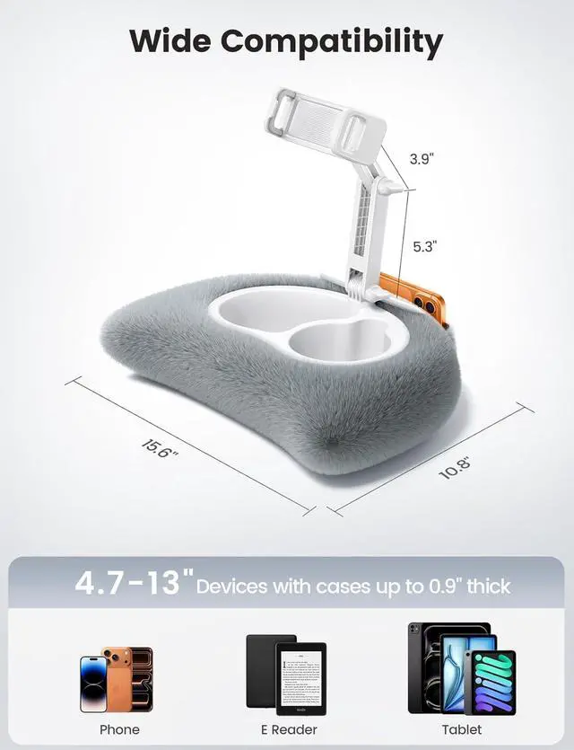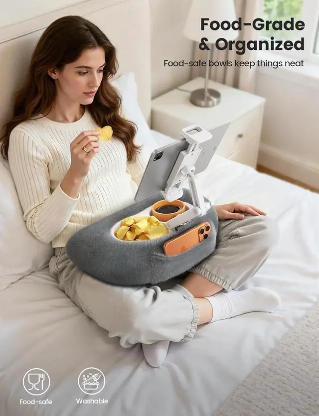 The removable pillow cover is machine washable and the food-safe bowls wipe clean in seconds making it easy to keep your iPad pillow stand fresh for everyday use. Wide Compatibility This tablet holder fits 4.7 to 13 devices with cases up to 0.9 thick like 2026 iPad Air 2025 / 2024 / 2022 iPad Pro 12.9 / 11 / 10.5 / 9.7 iPad Air 6 / 5 iPad Mini 6/ 5/ 4/ 3 iPad 5th/ 6th/ 7th/ 8th/ 9th/ 10th generation iPhone 17 16 Pro Max Plus Air Surface Kindle Fire HD E-readers portable monitors etc. Food-Grade & Organized The tablet pillow stand features food-safe bowls for treats while front pockets and a pen loop secure your remote stylus and phonekeeping snacks and essentials within easy reach.