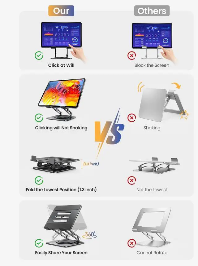 Rotation: A full 360° rotating base allows you to share content with colleagues or clients seamlessly without moving the tablet. This stand is ideal for meetings team huddles and presentationsSturdy and