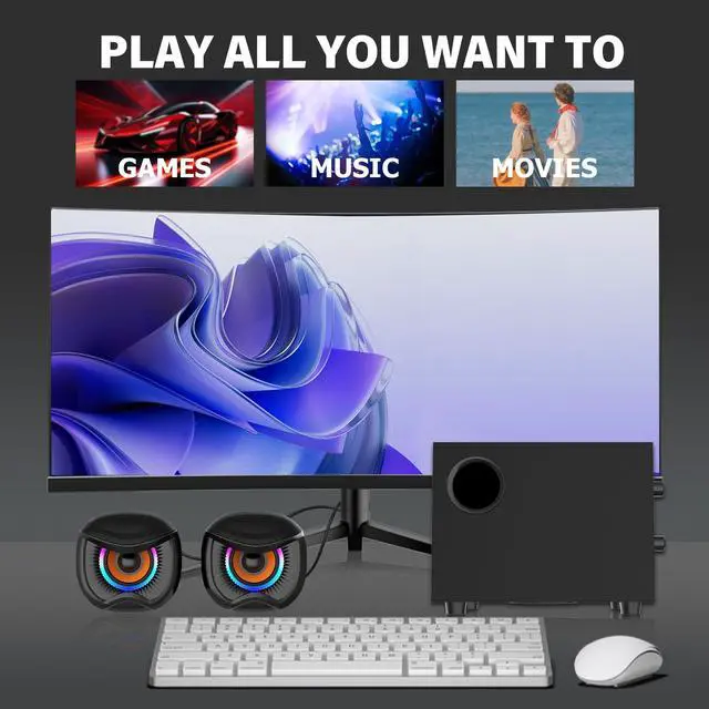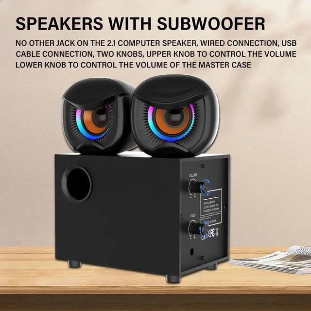 This is a desktop computer speaker system, a dedicated 2.1-channel stereo system for gaming. It features a 2-inch tweeter and a 3-inch woofer, with desktop speakers and a subwoofer. The wired USB-powered 3.5mm auxiliary speaker is compatible with PCs, laptops, tablets, and mobile phones.