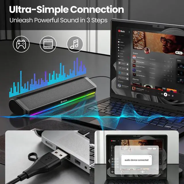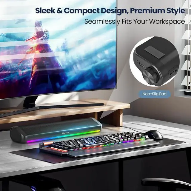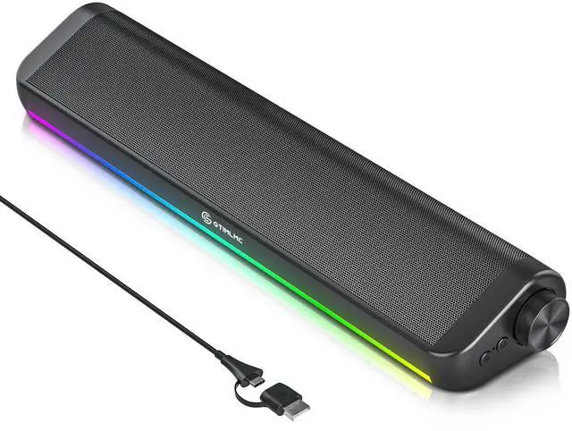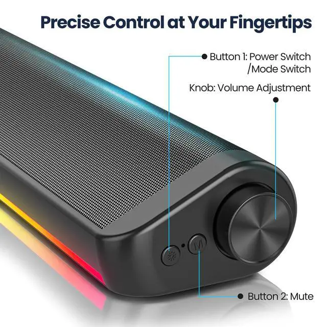 Computer Speakers for PC Desktop, 5 Dynamic RGB LED Light Modes, USB Wired Input, Easy-Control Knob, Stereo Gaming Soundbar for Laptop Monitor Black