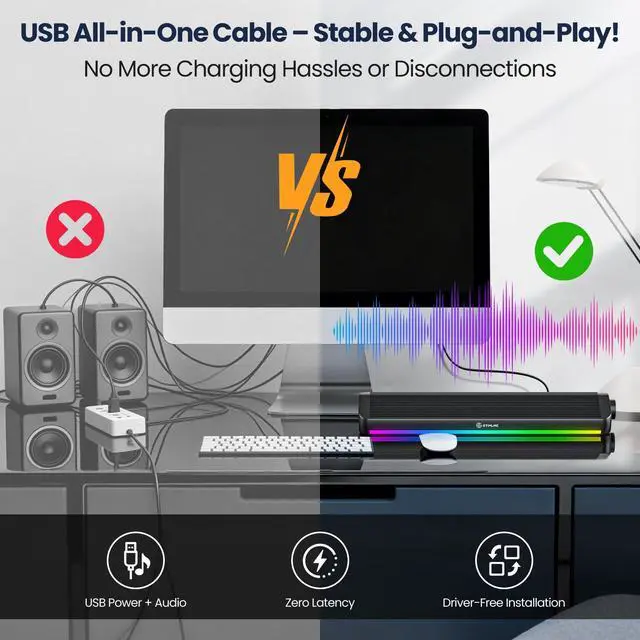 Stereo Sound Powered by upgraded 2x5W drivers, these PC speakers deliver crystal-clear audio for an immersive experience. Perfect for enjoying movies, videos, music, and games indoorselevate your desktop setup today