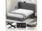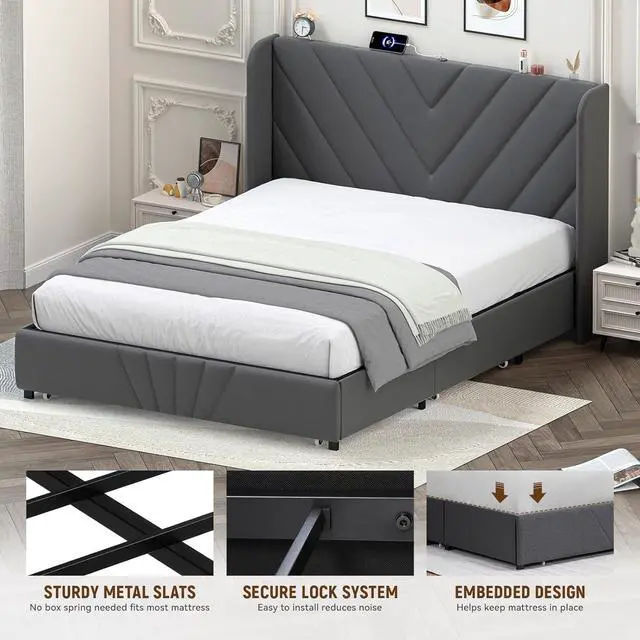 This modern queen-size upholstered platform bed features a V-shaped headboard with built-in USB/Type-C charging ports, soft gray linen upholstery with elegant stitching, sturdy metal frame with reinforced slats (no box spring needed), three spacious storage drawers (two side + one footboard), and a space-saving design ideal for apartments or small bedrooms.