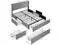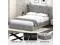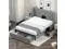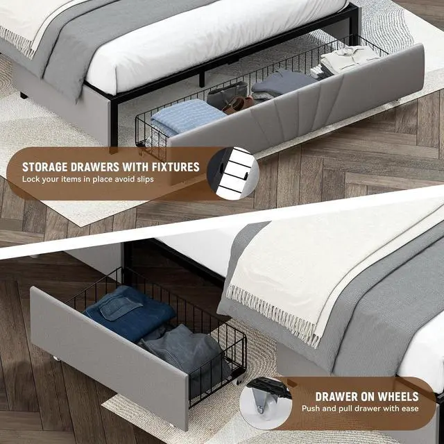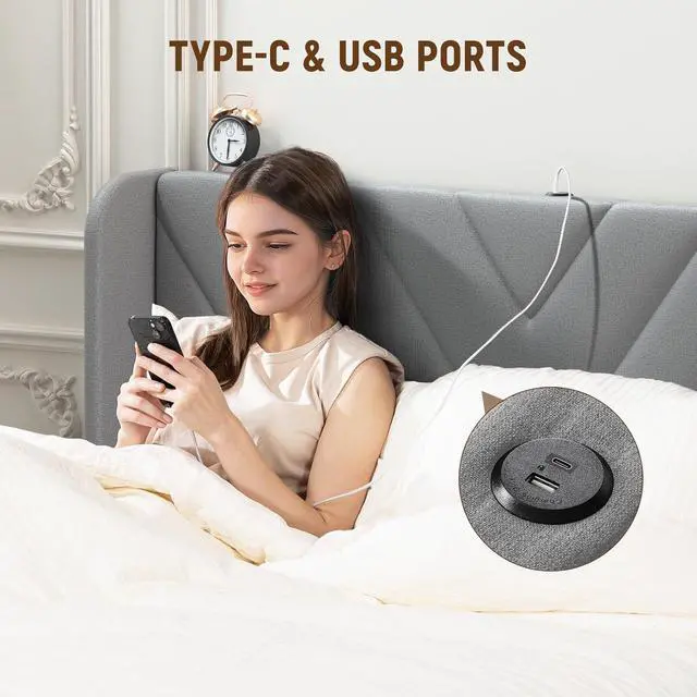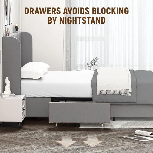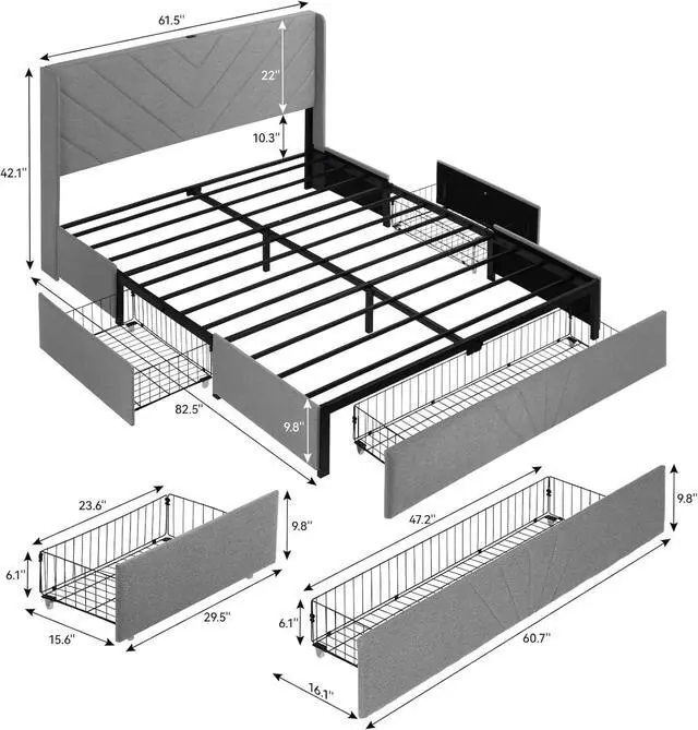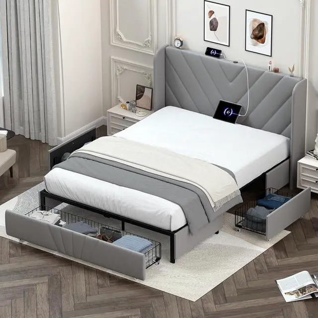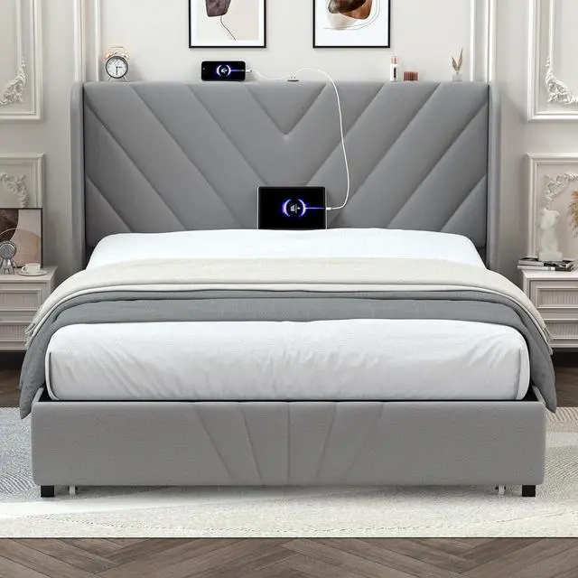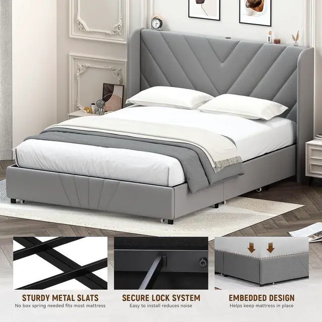 This modern queen-size upholstered platform bed features a V-shaped headboard with built-in USB/Type-C charging ports, soft gray linen upholstery with elegant stitching, sturdy metal frame with reinforced slats (no box spring needed), three spacious storage drawers (two side + one footboard), and a space-saving design ideal for apartments or small bedrooms.