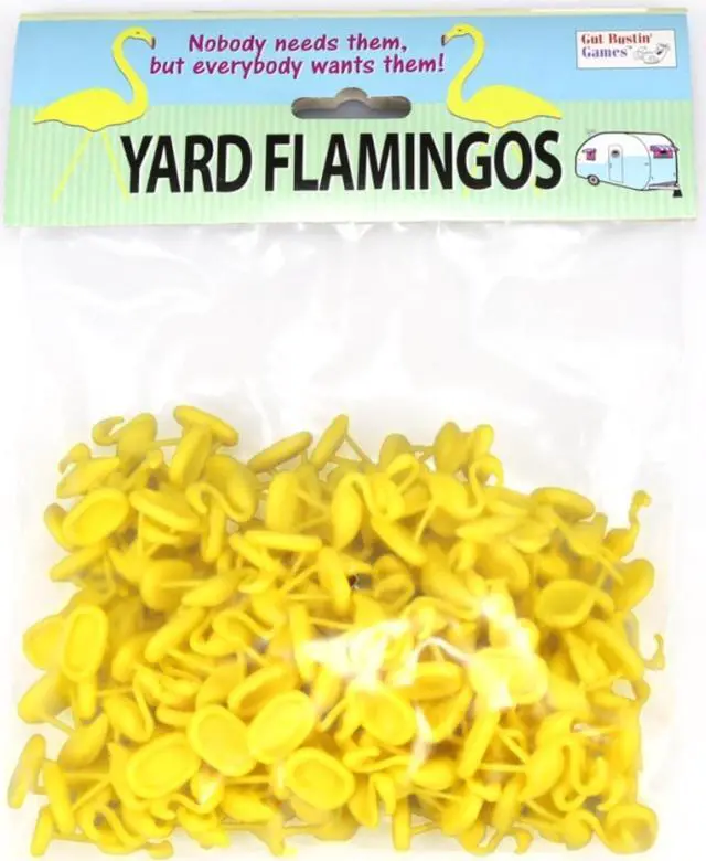 Yellow Yard Flamingo Miniatures Set Of 100 Gut Bustin Games. Get an extra set of 3D Yard Flamingo Miniatures from the Trailer Park Wars! Game! Use them as extra points for the game, or to charm (or annoy) your friends, family, and co-workers. Each set contains 100 Flamingos about 1.25 inches tall. The Trailer Park Wars! Game already contains 100 Flamingos. This set is not required for regular game play!