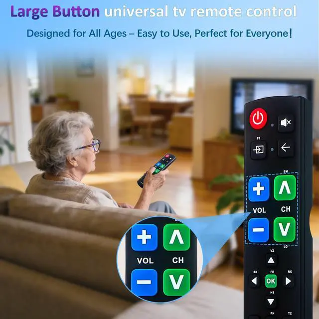 Easy Big Button DesignThe remote includes specialized features like an extra-large enter button, big button universal controls, and tactile feedback, catering specifically to seniors and those with limited dexterity or vision. It aims to provide a more comfortable and accessible user experience.