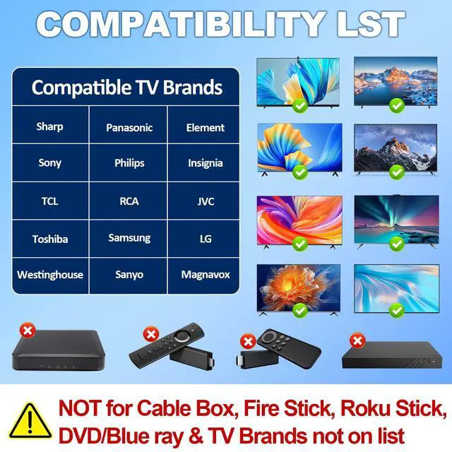 Compatible with All TVsThis universal remote control works with Samsung/LG/VIZIO/Sony/Hisense/Philips/Panasonic/Sharp TVs and more TVs. (Please note that this remote is NOT compatible with streaming devices, cable boxes, or unrelated TV platforms)