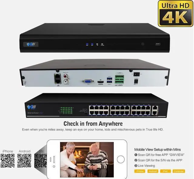 • 3 Easy Steps QR Code Setup - 1) Download & install app "GWView". 2) Go to NVR setting -> Network -> Scan the QR code with your app. 3) Your Cameras are Ready to View.