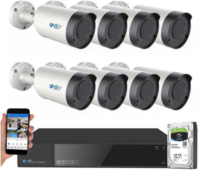 Package Includes: 1 x 8 Channel 4K NVR with 4TB Hard Drive (GW7808NP 4TB) 8 x Bullet 4K 8MP UHD Outdoor/Indoor IP Camera (GW8150MMIC) 4 x 100 feet Ethernet cable for Connecting Cameras to PoE Switch (GWCAT100) 4 x 60 feet Ethernet cable for Connecting Cameras to PoE Switch (GWCAT60) 1 x 10 Feet Ethernet cable for Connecting Router to PoE Switch (GWCAT10) USB mouse and Remote Control for Operating NVR Interface Mounting screws for Mount cameras Quick Guide & User Manual Feature: Ultra HD 4K (8MP) Resolution Capture high-definition 4K 2160p HD video four times higher than 1080P cameras.Each GW IP camera delivers 8.0 megapixel at 3840 x 2160 pixels with sharper and larger image and video than other security cameras. 2.7mm-13.5mm Motorized lens You can control the angle of view of the camera from NVR or a computer or smartphone or tablet. Once the camera is mounted and set it in the direction you'd like it to look at, you can control the zoom at the touch of a button without having to climb up to the camera and change the lens settings. At the widest setting of 2.7mm, you can expect to have a 125 degree view. When you are zoomed in all the way at the 13.5mm zoom length, you will get a 20 degree view and be able to view up to 120ft IR distance. Built-in Microphone for Audio Surveillance Each camera built-in microphone for audio recording, this can provide you with more information (such as voices) should an intrusion ever occur. It will also expand your security coverage beyond the camera's field of view and can help assist with interpreting events (even if they occur off-screen). 15 AI Smart Functions This GW Secuirty camera system have 15 AI Smart Functions include Area Intrusion, Line crossing, Region Entrance, Region Exiting, Fast Moving, Object Missing, Unattended Object, Loitering Detection, Parking Detection, Human Detection, People Gathering Detection, Blurred detection, Scene change detection, Audio exception Detection, Crossing Line Statistics. The latest Starvis Starlight Technology It realizes full color video recording at night in very low light conditions which other infrared camera can't do. H. 265+ technology H. 265+ is the latest video compression which brings extensive possibilities and optimism to IP Camera, it also helps keep files sizes low without losing the 4K video quality Human Detection Human detection can reduce many false alarms than motion detection. Once the human or motion detected, the real-time alert notification will be sent to you via E-Mail,FTP & mobile app. NVR Features: Support 8 Channel Ultra HD 4K 8MP @ 30fps Realtime each channel H.265+ Video Compression Expandable hard drive space. Supports 2 hard drives slots, each HDD supports up to 12TB (total capacity 24TB) Support VGA & HDMI video outputs. Real time HD recording and Digital Zoom function can catch people's face and license plate. Support Cloud Storage (Google Drive & Dropbox) / Cloud Upgrade with One-Click Motion Detective & Email Alert 24 hours a day 7 days a week Digital Zoom up to 20x for a larger view of smaller details When Viewing Live or Playing Back Footage Supports Remote View via smartphone & 4G/5G Mobile with each of those systems below: Windows XP, 7, 8, 10, Mac, iPad, iPhone, Android, Mac Camera Features: 8MP (3840 2160) Color Night Vision Smart AI video recording camera Built in Microphone for Audio surveillance Power over Ethernet, Remote Mobile or PC/Mac view Protection Level: IP66 Waterproof for Outdoor or Indoor Use Camera offers 2.7-13mm Motorized Zoom Autofocus Lens and 18Pcs Infrared SMD LEDs Lights for Up to 120 feet Night Vision Distance in total darkness. Services Provide: No Hassle 30 Days Returns No Restocking Fee No Handling Fee Free One Year Warranty Free US-based Tech Support