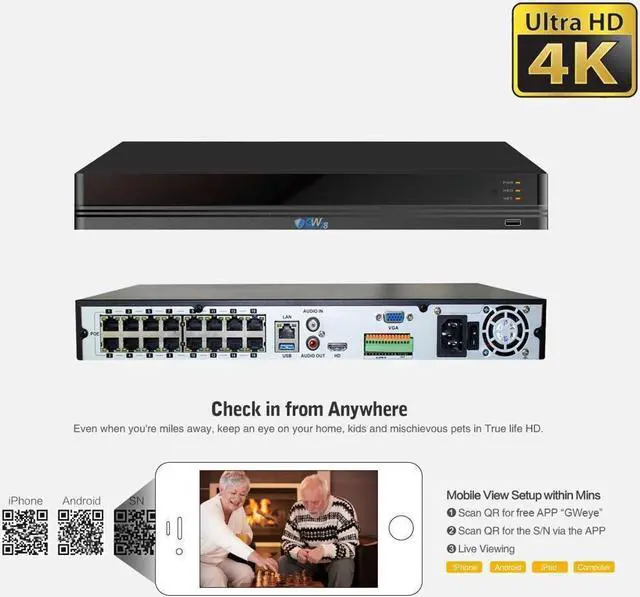 Capture high-definition 4K 2160p HD video four times higher than 1080P cameras.Each GW IP camera delivers 8.0 megapixel at 3840 x 2160 pixels with sharper and larger image and video than other security cameras.