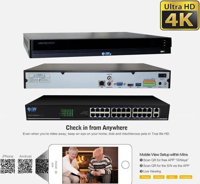 • Easy Steps QR Code Setup - 1) Download & install app "GWEye". 2) Go to NVR setting -> Network -> Scan the QR code with your app. 3) Your Cameras are Ready to View.