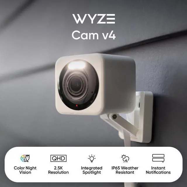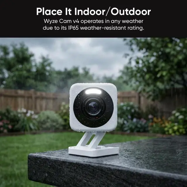 • Indoor/Outdoor Versatility - Engineered for durability with IP65 weather resistance, Wyze Cam v4 is an ideal security camera, offering reliable house surveillance in any weather. It's both an indoor camera and outdoor security camera. Wyze Outdoor Adapter (sold separately) is required for Outdoor use.