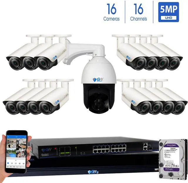 Features: * 16 Channel Max 5MP HD 1920p NVR support up to 5MP/4MP/3MP/2MP 1080p real-time recording & viewing on all channels, 8TB high quality 100% duty-cycle hard drive pre-installed * 15 x high definition 5MP 1920p weatherproof bullet cameras with night Vision up to 120ft. Built in 2.8 ~12mm Manual Zoom Varifocal Lens which allow you to adjust the angle of View * 1 x high definition 5MP 1920p weatherproof PTZ camera with 360° rotation 90° tilt, and a powerful 20 x optical zoom and auto-iris, auto-focus. Pan Tilt Zoom Camera Remotely Through NVR, Computer, Phone, Tablet with 12Pcs Array IR LED up to 500FT IR night Vision. * Power over Ethernet setup is clean and simple with a single network cable, built-P2P service and support ONVIF agreement and QR Code Scan * Instant mobile viewing on iOS and Android smartphones / tablets/Windows 7 8 10/Mac. 1 Year Warranty & Free Tech Support From US