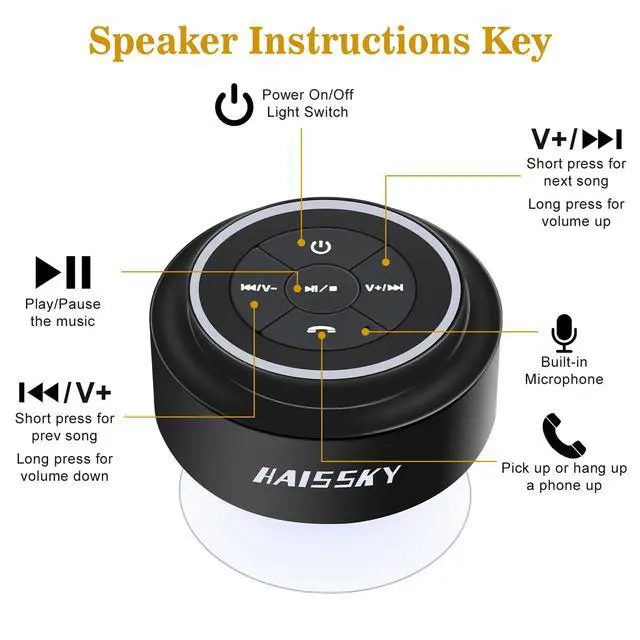 FULLY WATERPROOF, EVEN FULLY SUBMERSIBLE: With Its level IPX7 certification the Haissky shower speaker is so versatile around water it's not just water resistant it's capable of being fully immersed in water up to 3 feet in depth. Listen to your favorite music with this fun unit. You can even receive incoming calls while in the shower, bathroom, car, boat, beach, patio or anywhere else without risking your expensive mobile device as it is also shockproof and dustproof